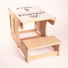 Taburete de cocina Montessori realizado en placa MDF que se puede transformar fácilmente en mesa y silla, quitando la parte superior y colocándola detrás de la parte inferior. Incluye stickers para personalizar este mueble con original diseño y color.